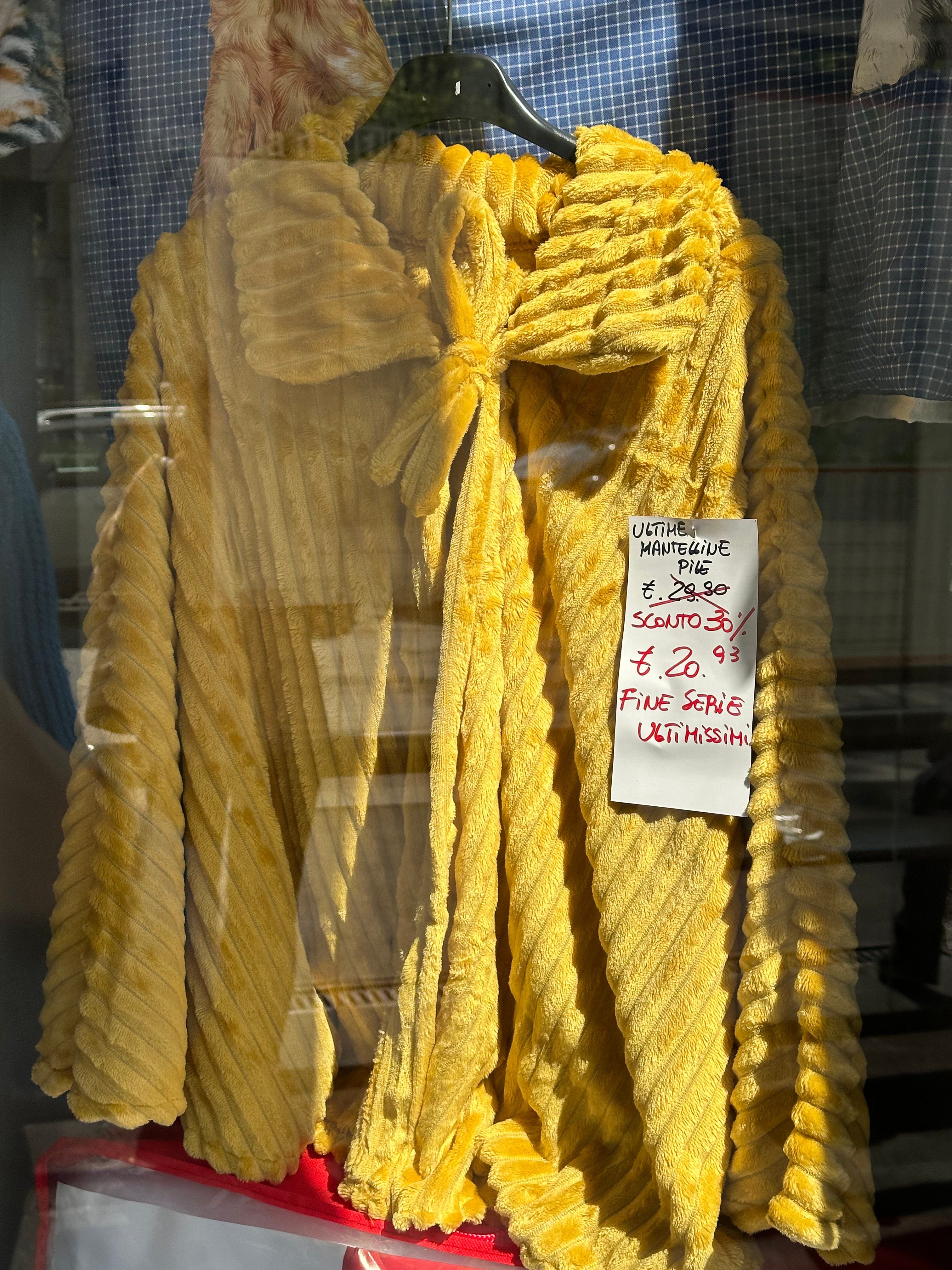 And just when you think there is nothing left to uncover, the slight change of location in the same town brings with it a surplus of new scenes. After returning the keys to my Milan apartment, I spent two nights in a hotel only ten minutes away, and suddenly there was a sea of new sidewalks just waiting for me to traverse. A bright yellow cropped bathrobe with a happy bow in the most decadently piled chenille, practically beamed at me through the window of a small shop. Reminding me that there are always new facades to be explored if the right eyes are ready to discover.