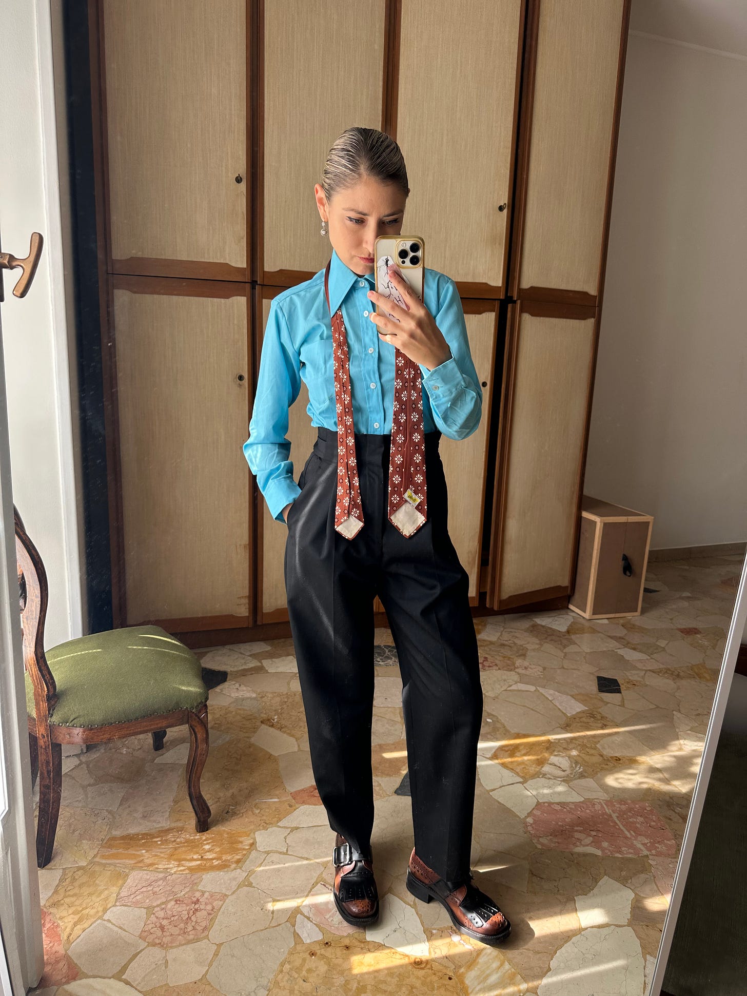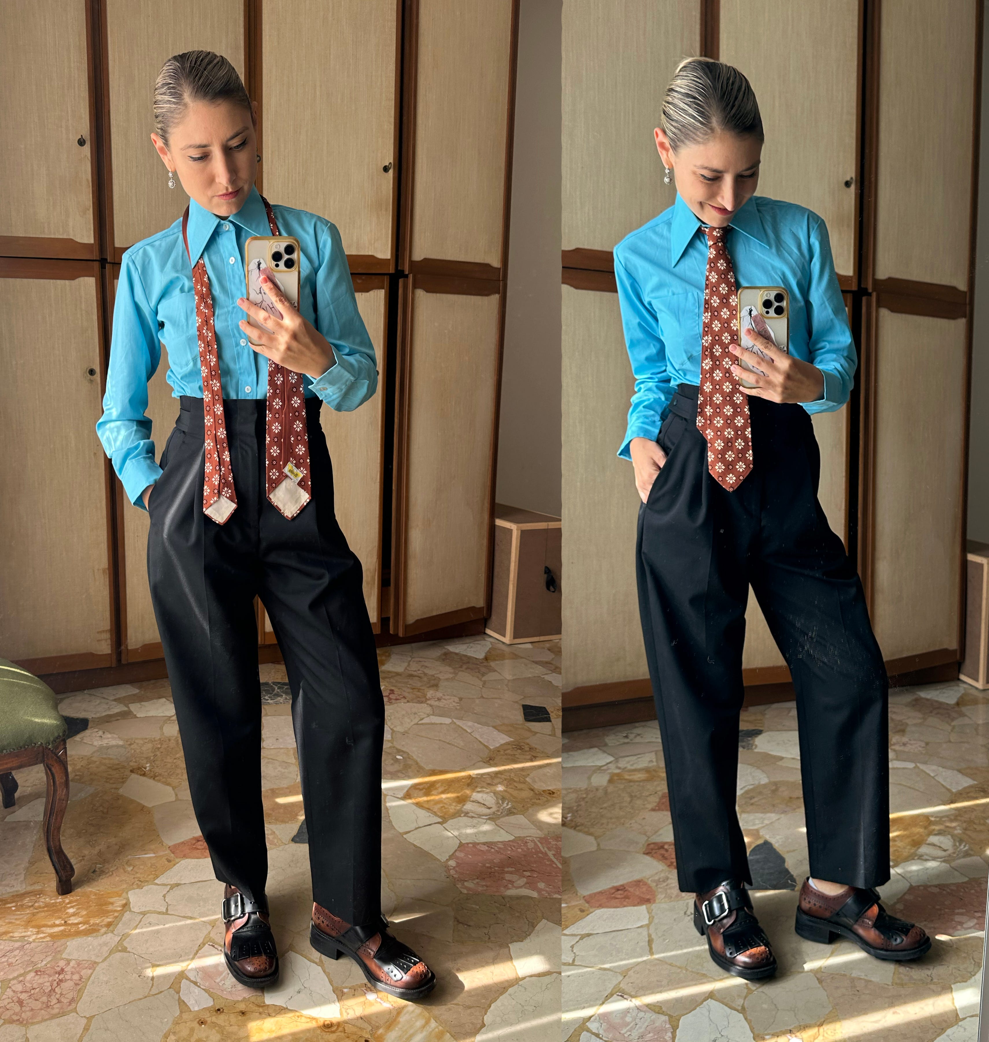 My first attempt at styling the above tie was to pair it with this vintage '70s shirt, which felt a bit too contrasting/bright. I decided to move towards a more traditional light blue button-down instead.