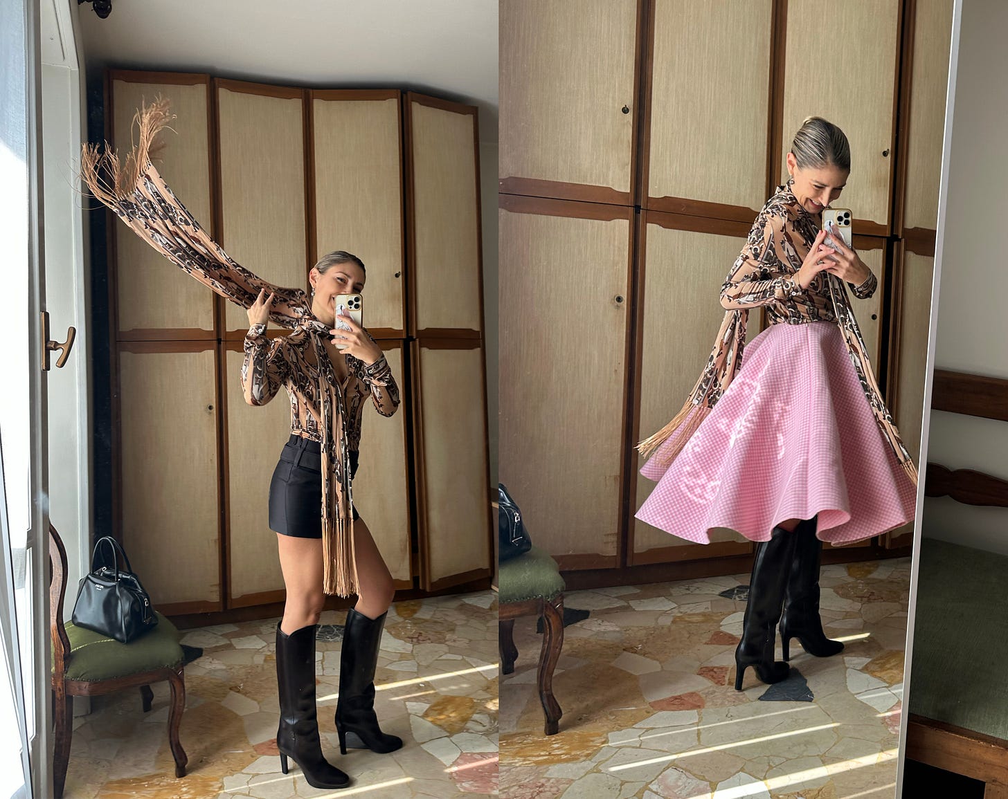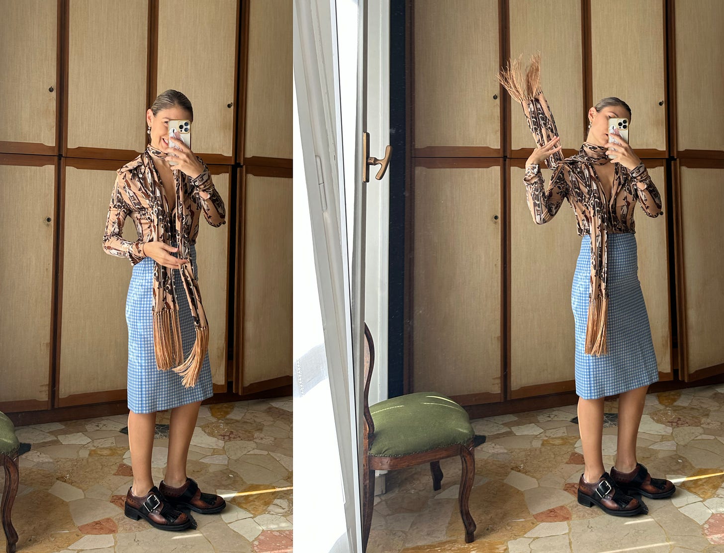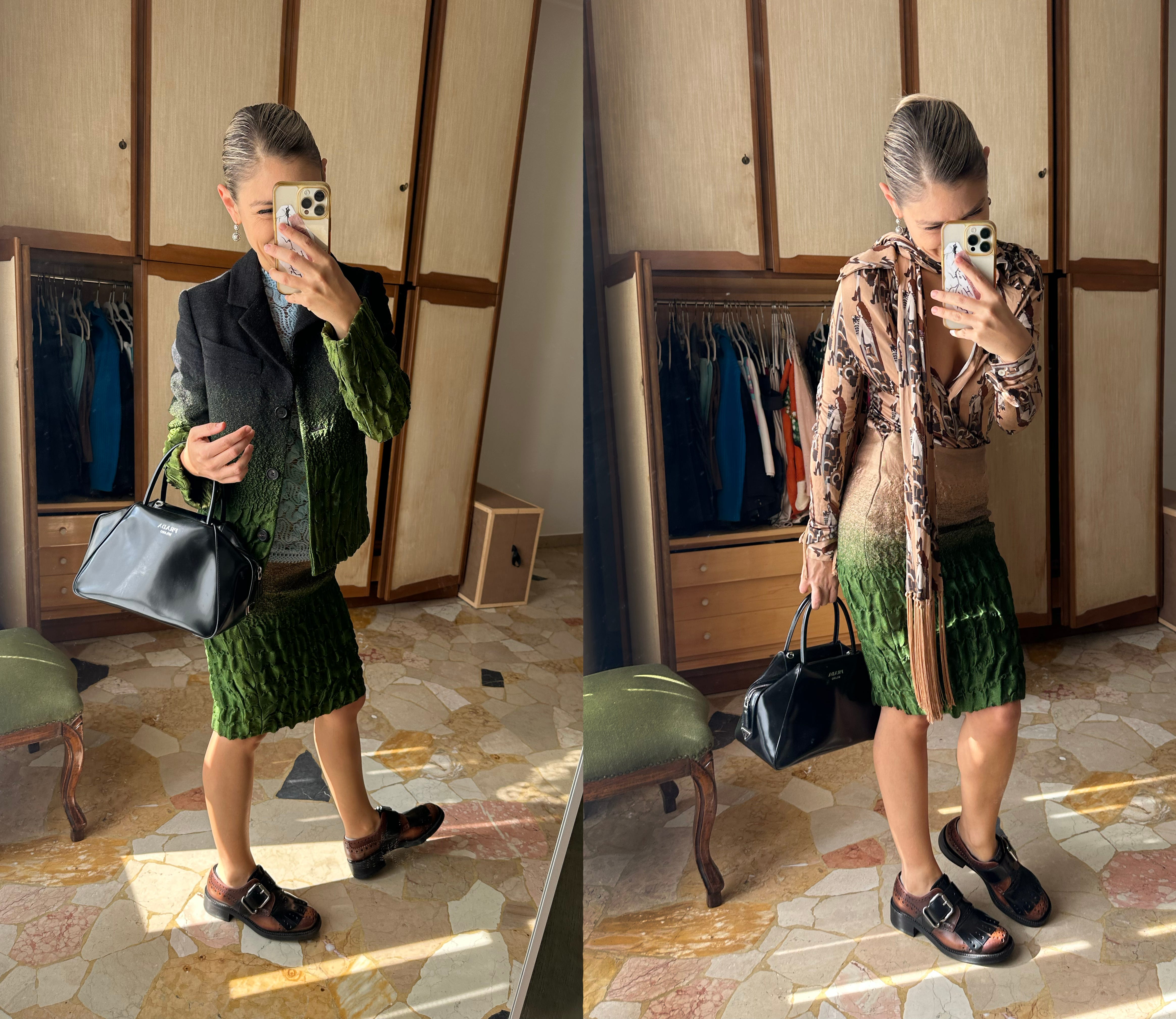 Before buying something new, try mixing and matching what you already have in interesting and unexpected ways. Although the vintage Celine top & matching scarf (above right) has no pink, green, or blue in it, in the two preceding collages and the one below, I mixed this top with three different skirts. At first glance, these would seem not to match, but once sandwiched between the top and a neutral shoe, all three combinations play in their own unique way.